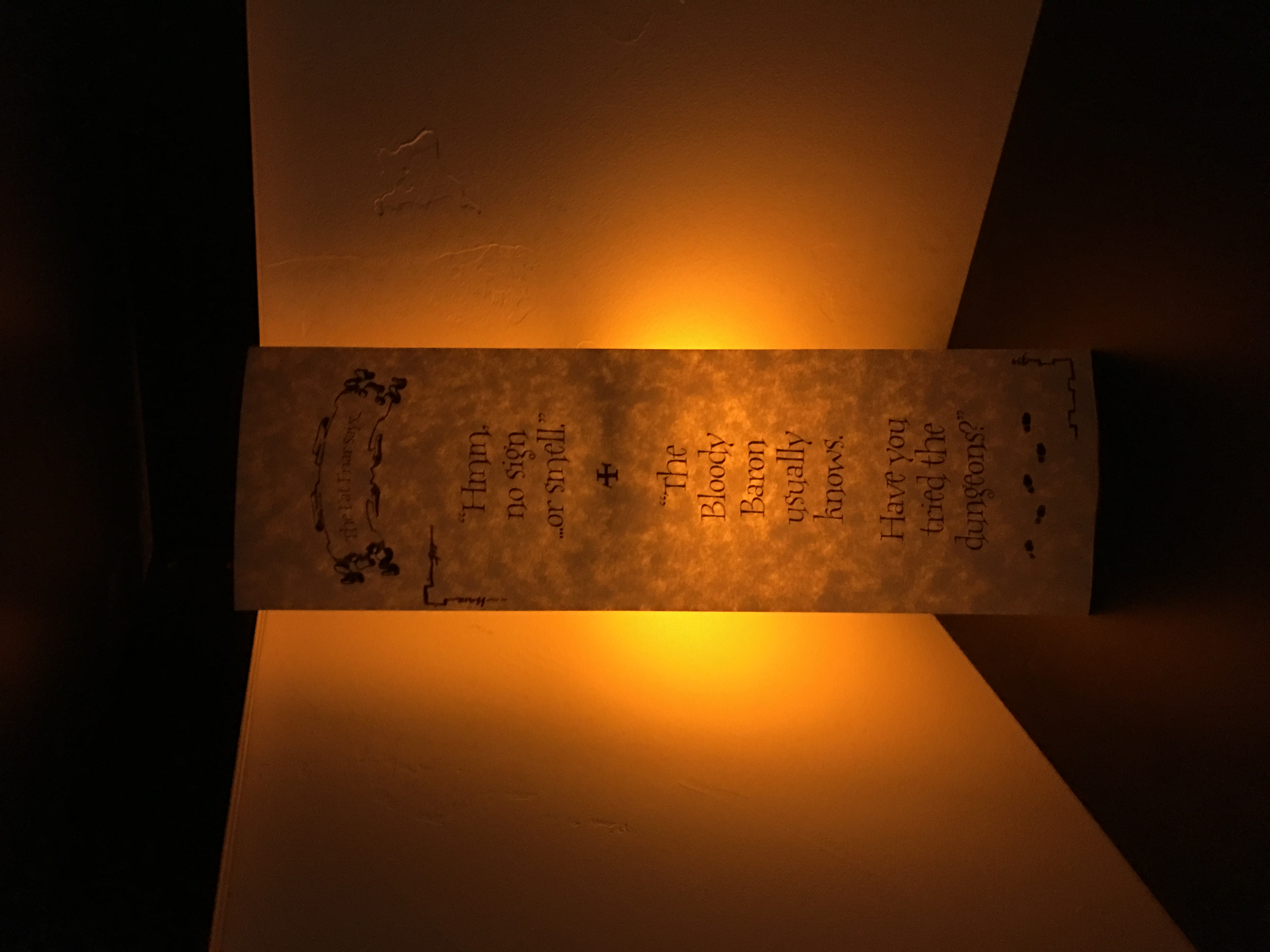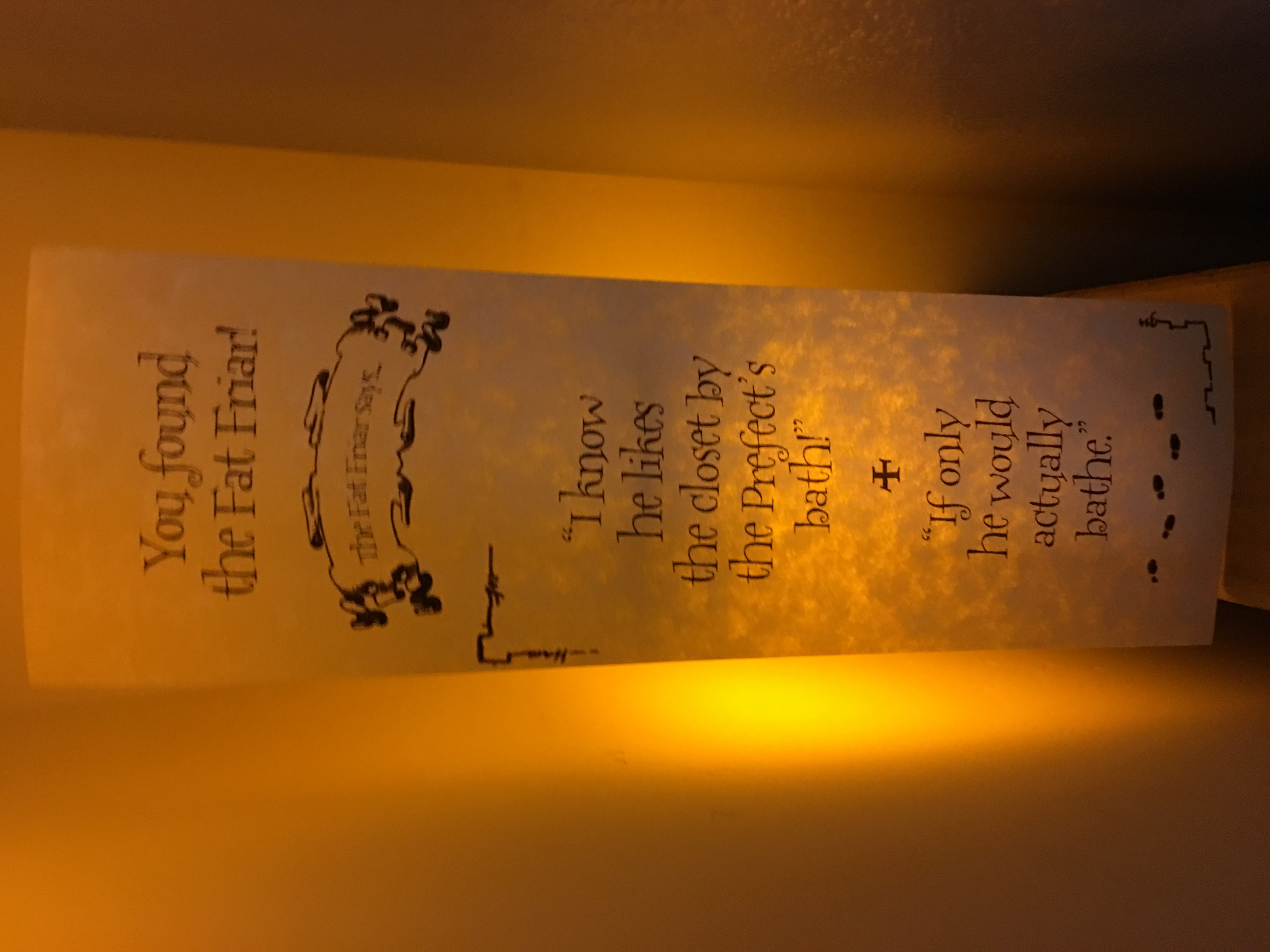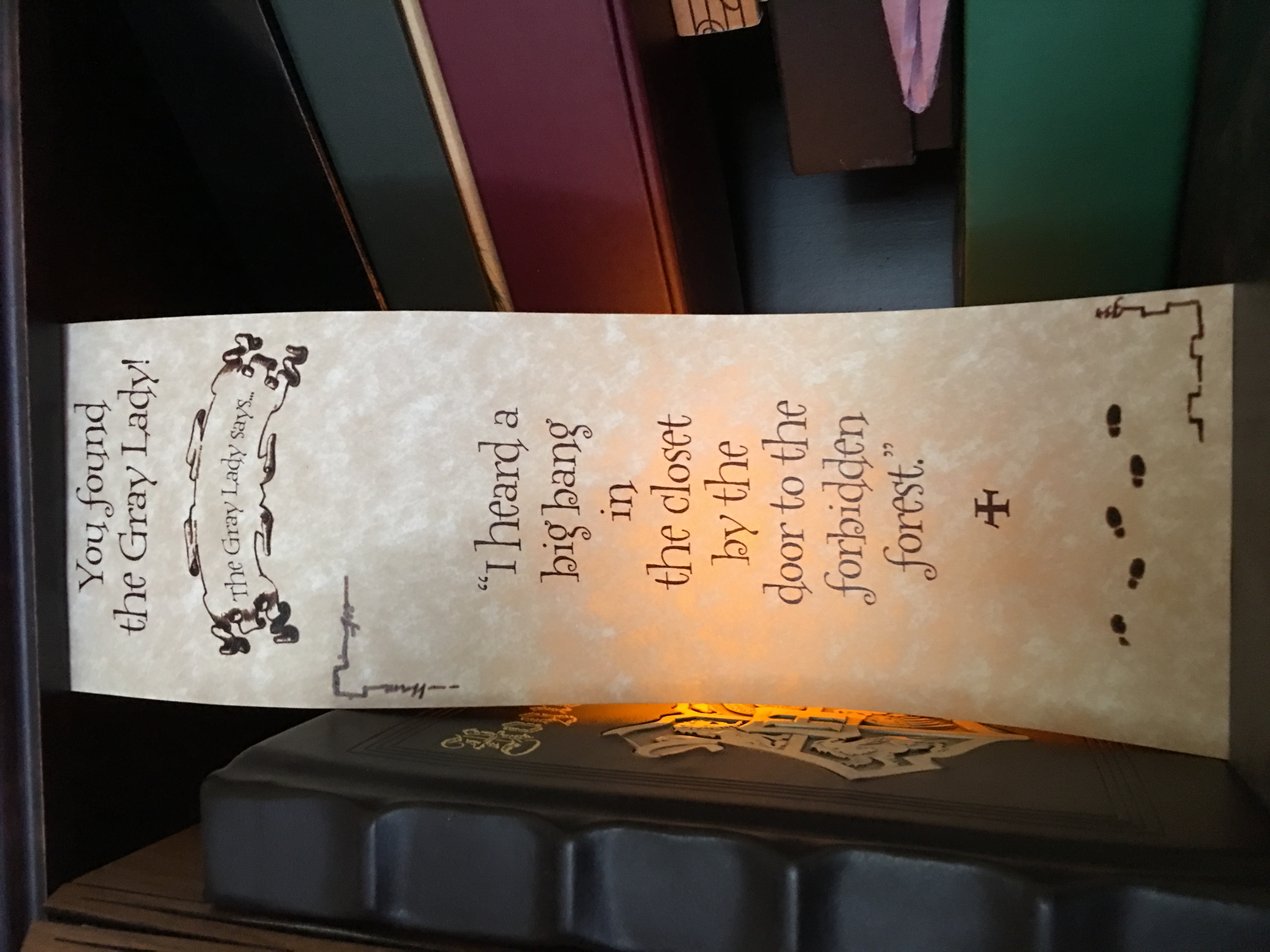 The concept for this year’s scavenger hunt was that Peeves, the poltergeist, has hidden your present and you need to get the ghosts of Hogwarts to help you find him (and your present). My vision was to have all of the clues hidden inside a closet or a dark cabinet. They would be in front of a candle (electric) and so have a spooky glow.