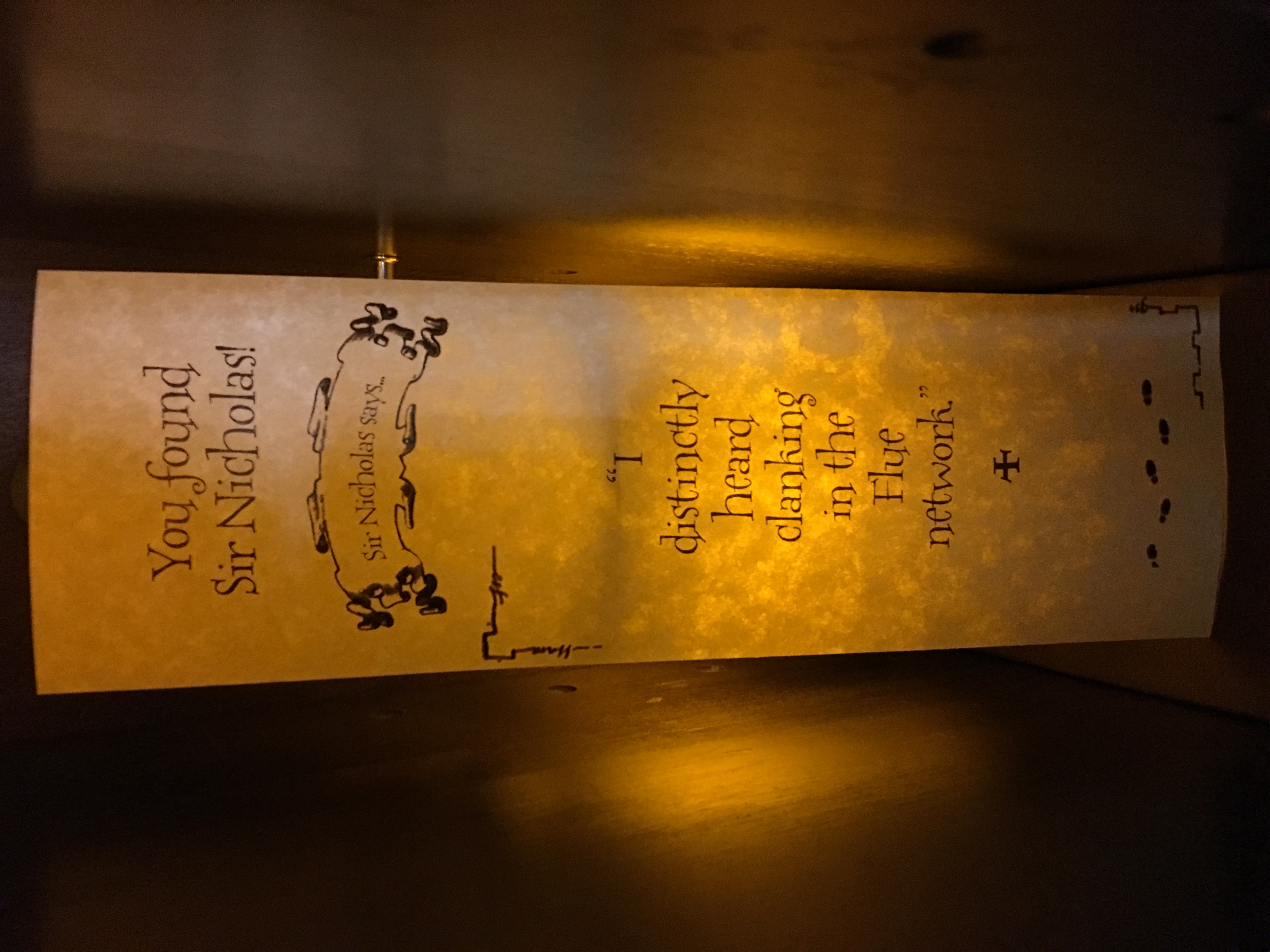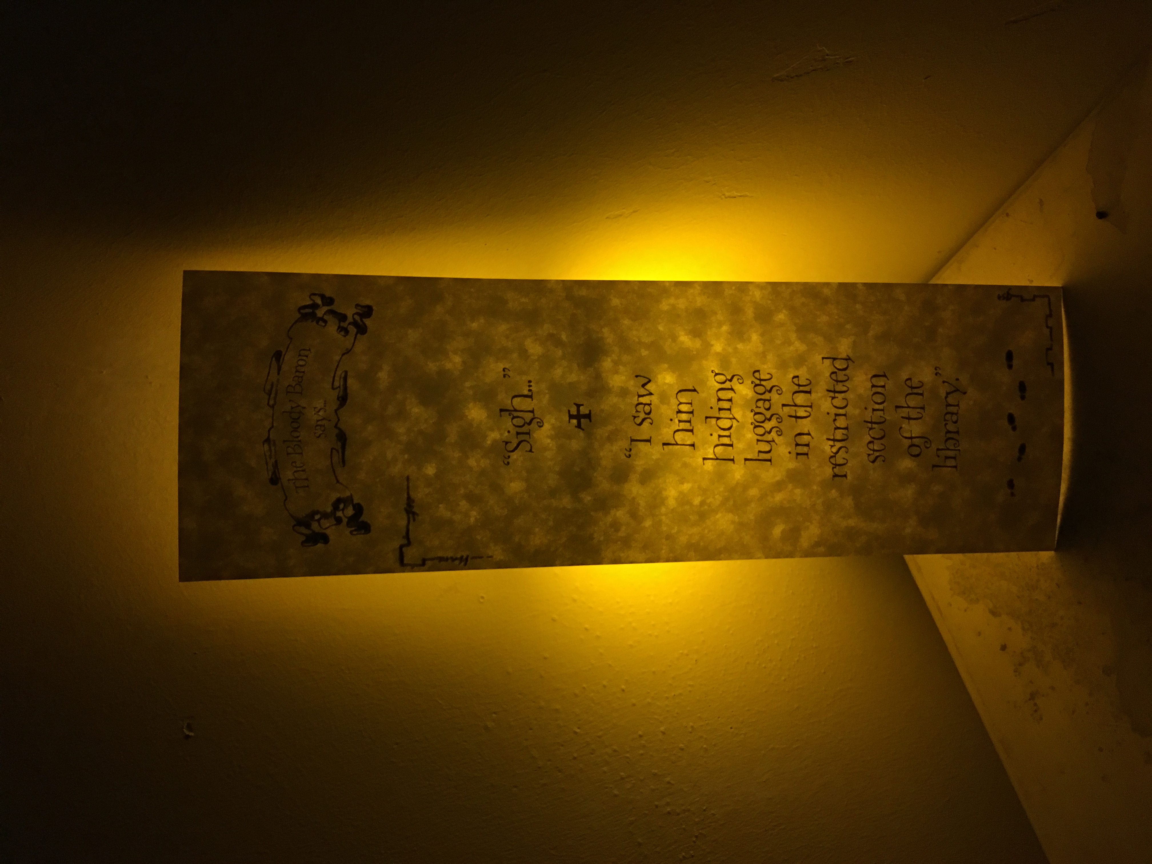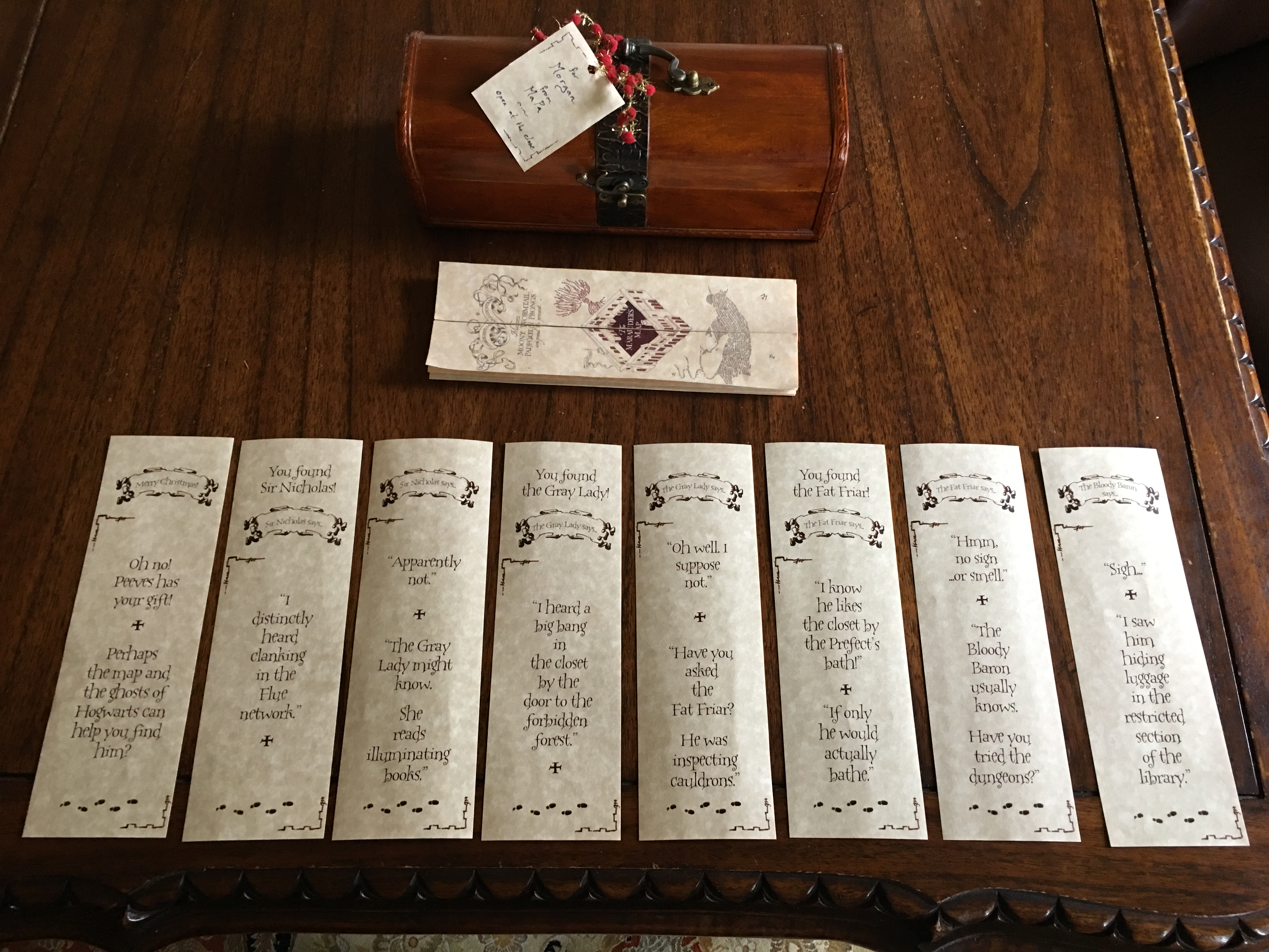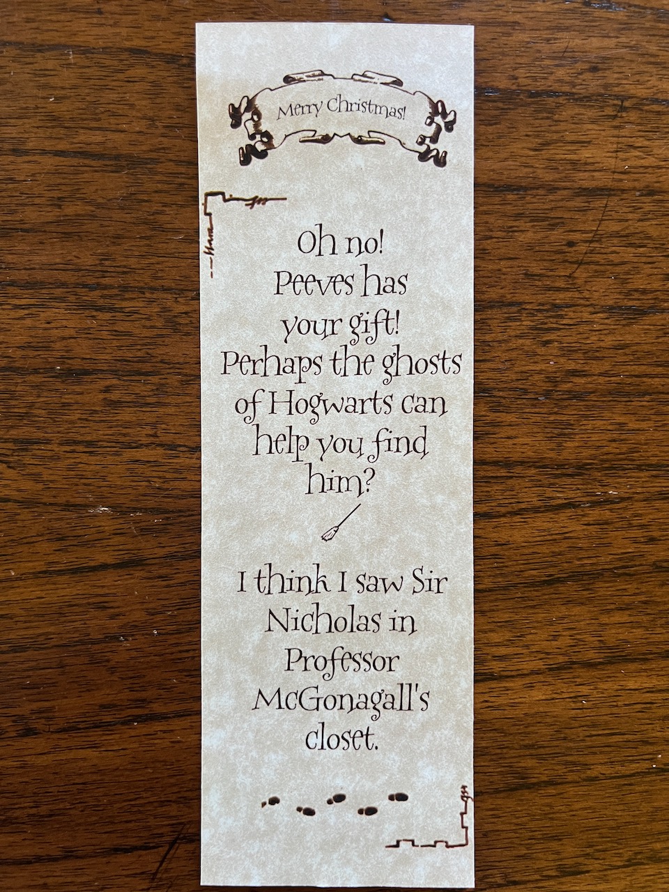 The concept for this year’s scavenger hunt was that Peeves, the poltergeist, has hidden your present and you need to get the ghosts of Hogwarts to help you find him (and your present). My vision was to have all of the clues hidden inside a closet or a dark cabinet. They would be in front of a candle (electric) and so have a spooky glow.