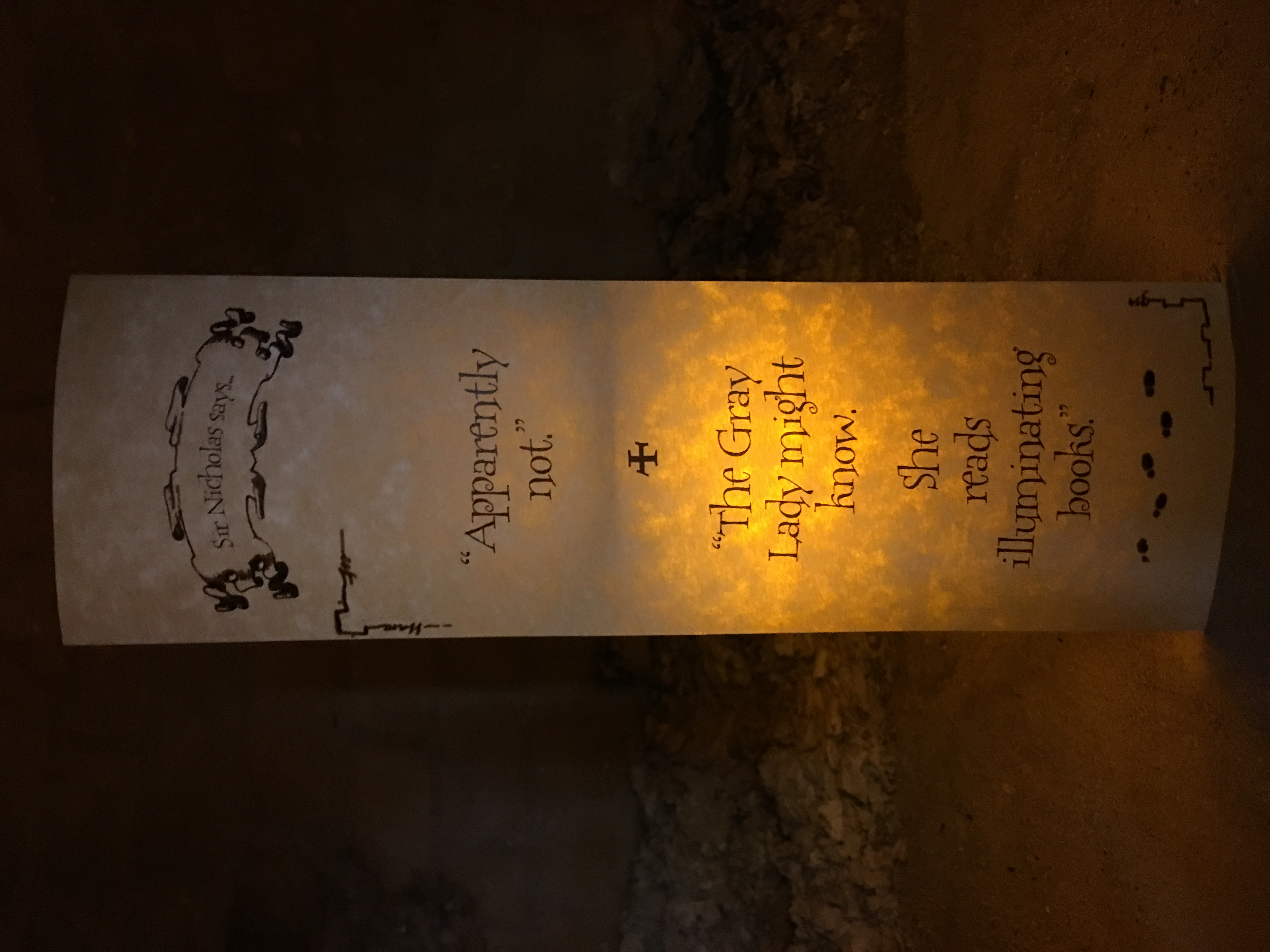 I was happy to have the locations the ghosts were found match their personality. Sir Nicholas, a Gryffindor, is found in McGonagall’s closet, the Gray Lady, a Ravenclaw, is found reading a book, the Fat Friar is found inspecting pots in the Larder and the Bloody Baron is found moping in the dungeons. ↩