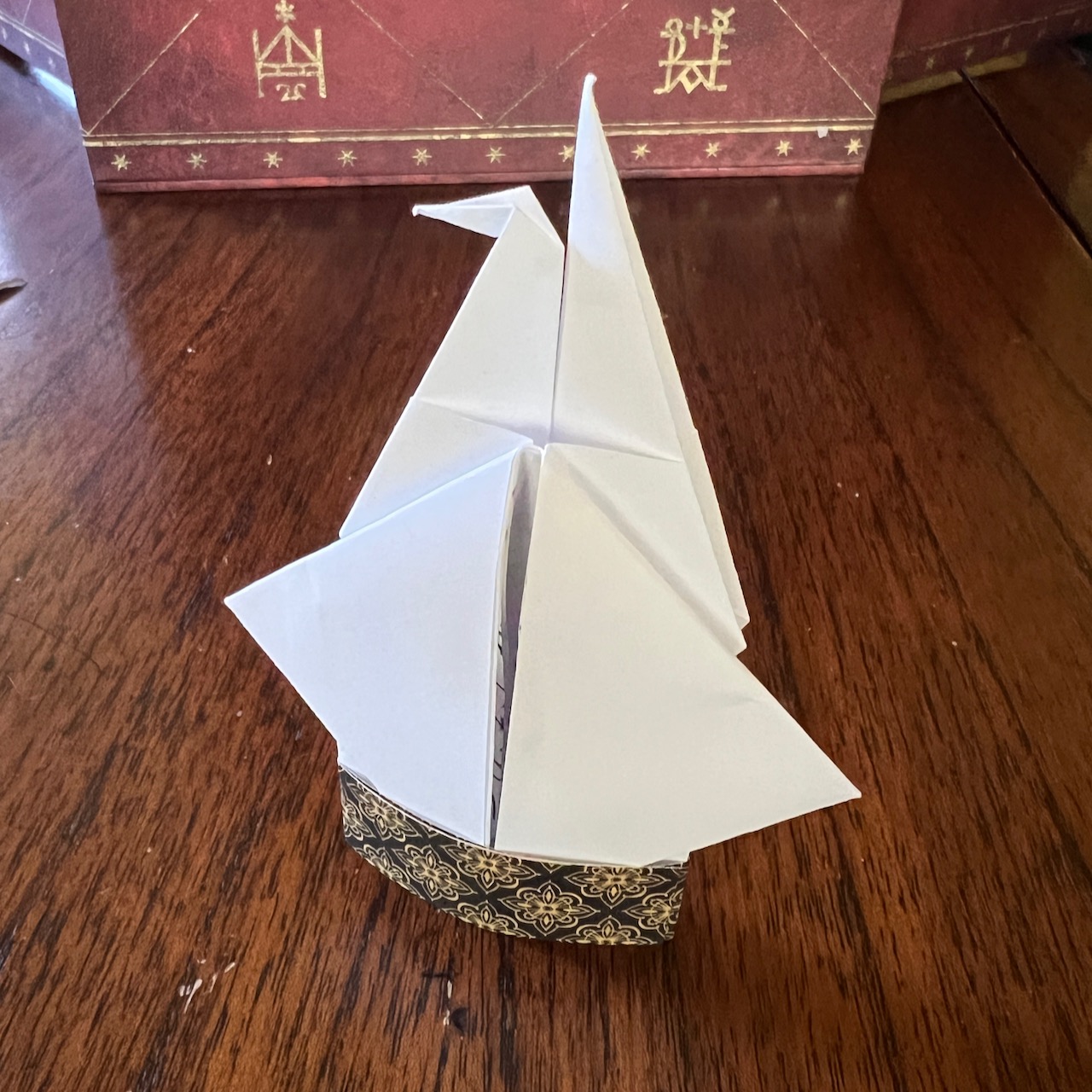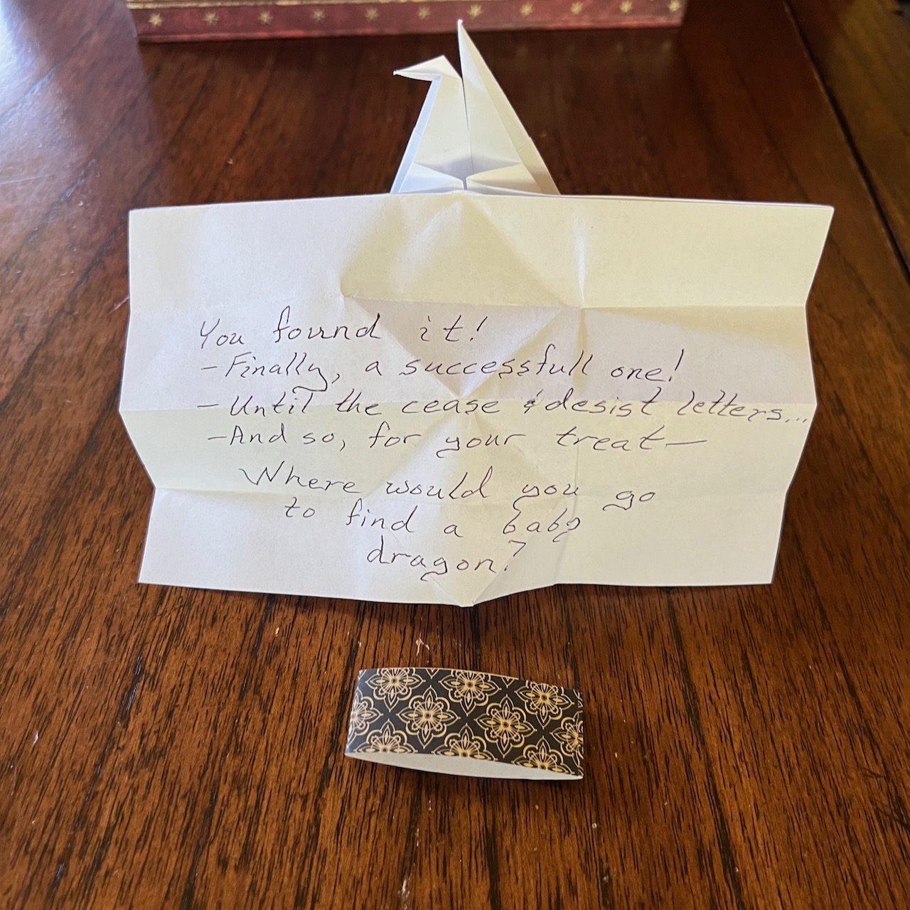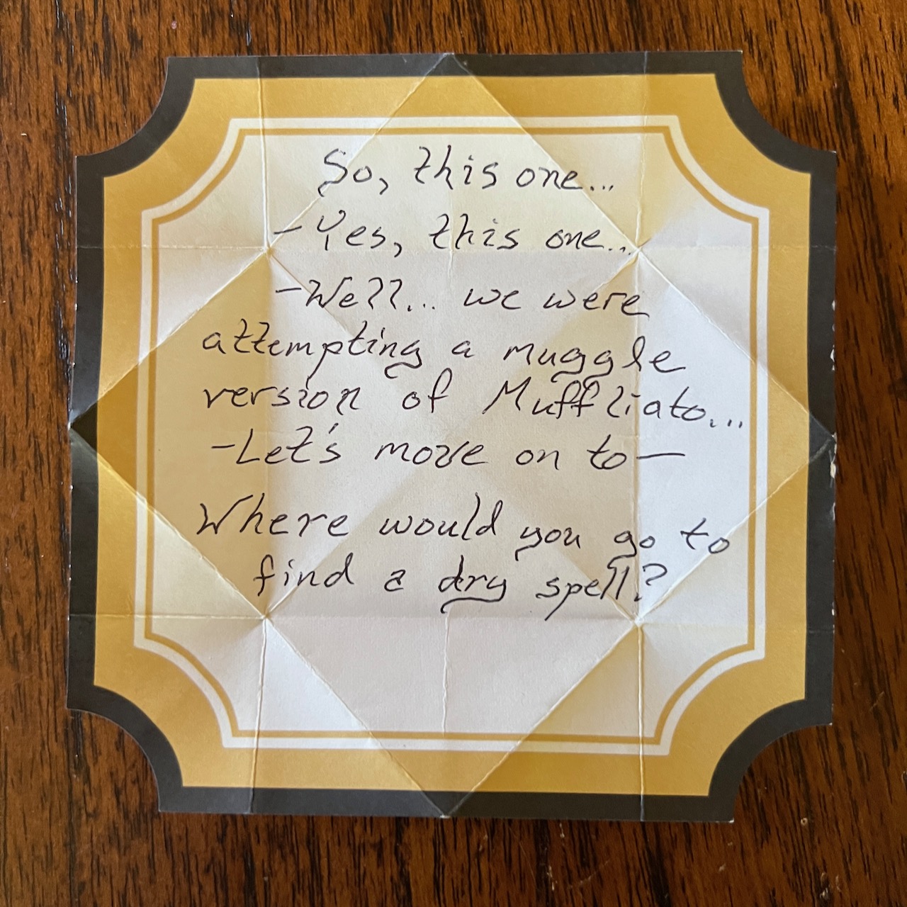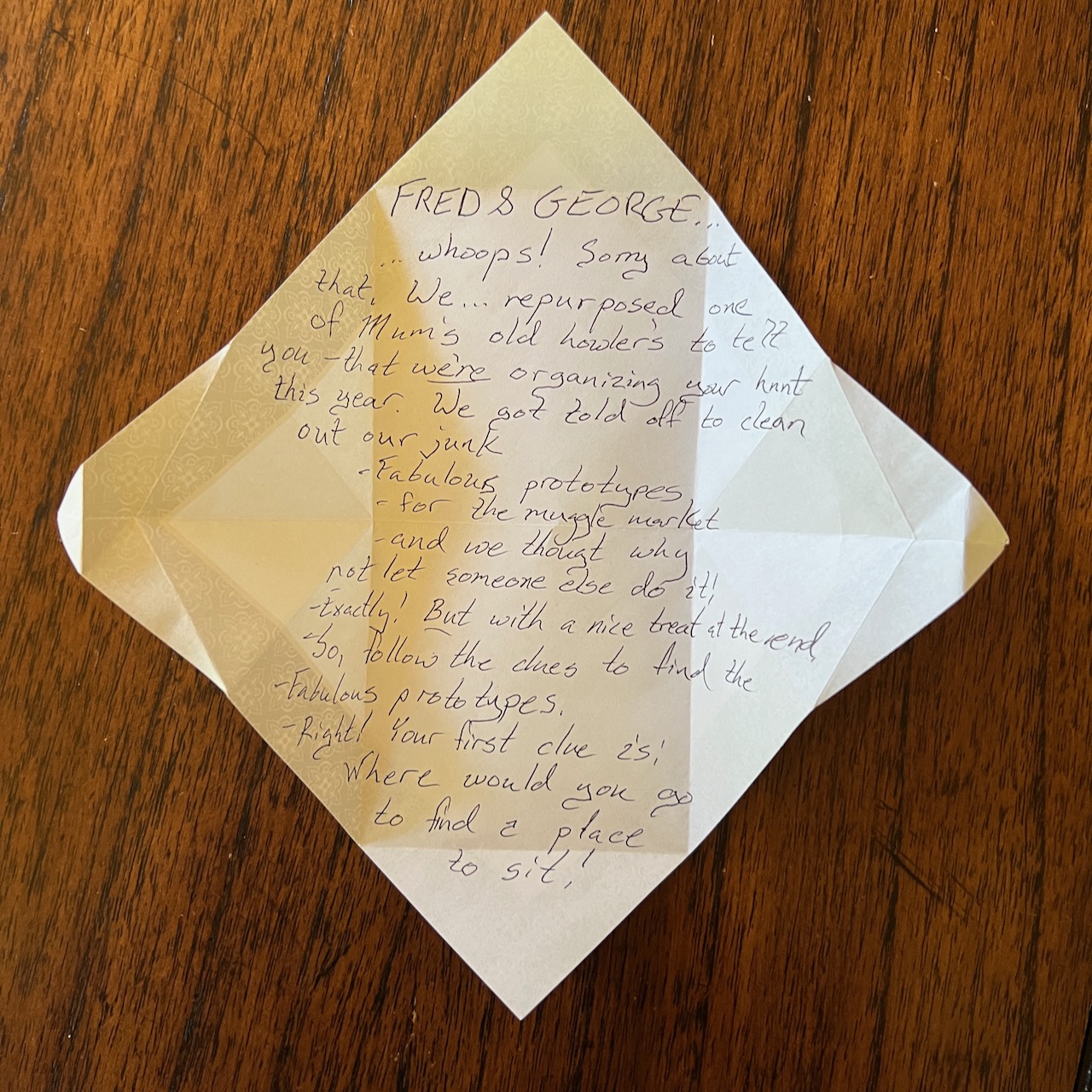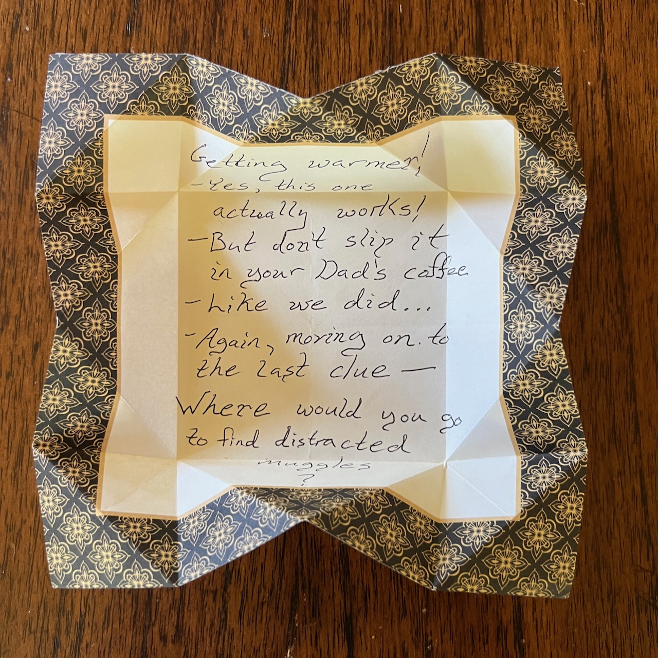 There used to be a Boswell’s near us with a lot of joke items such as whoopee cushions, stink bombs, gelling liquid, etc. And so I thought about having a “Fred & George” scavenger hunt where they would get you to clean up their junk (the joke items) as part of the clues. I love origami and there are several scenes in the Harry Potter films where the characters send or receive letters that are folded in some origami pattern and I thought I would incorporate that as well. Many of the following origami cards came from Origami Card Craft, by Karen Elaine Thomas.