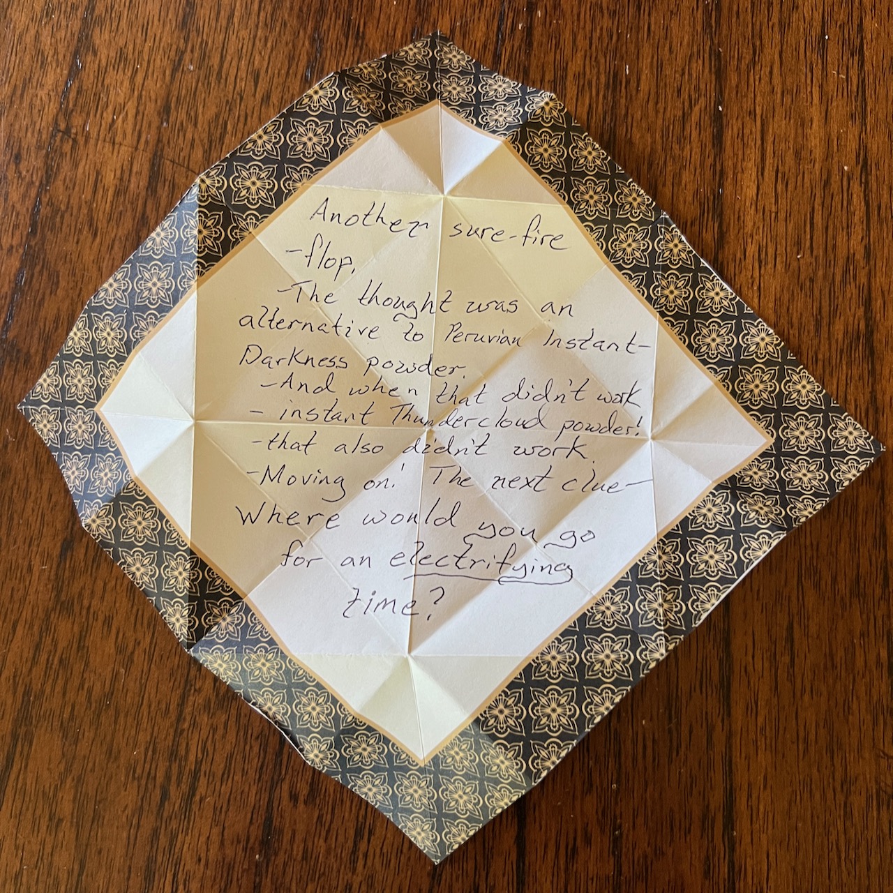 Moving on, the next clue is:Where would you go for an electrifying time?
