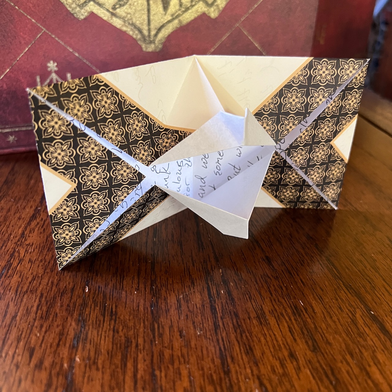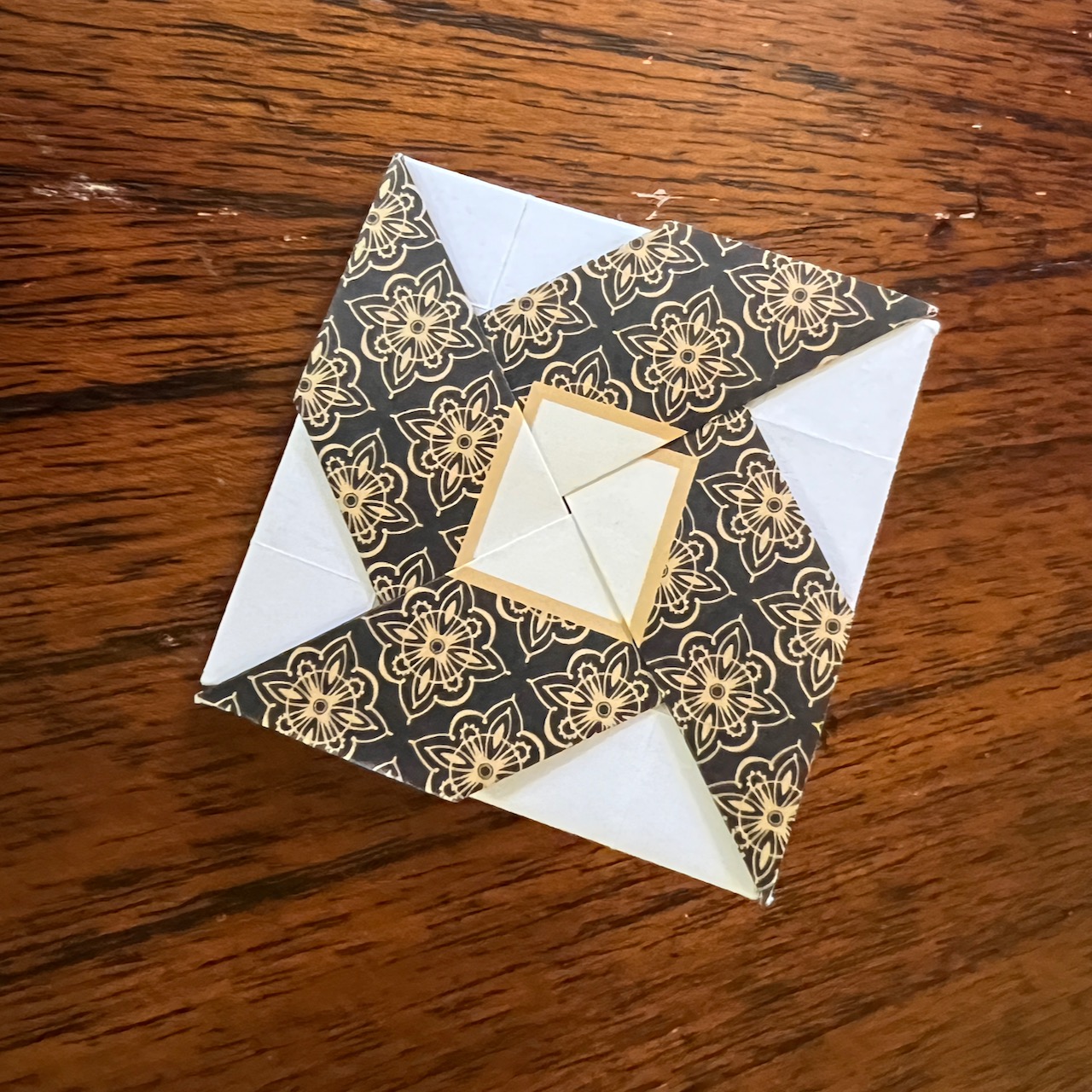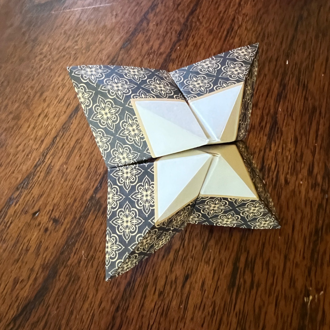 A standard Fortune teller fold, what made it distinctive was the paper, a gift from my mom. It has some very decorative borders that show off well in many of the folds.