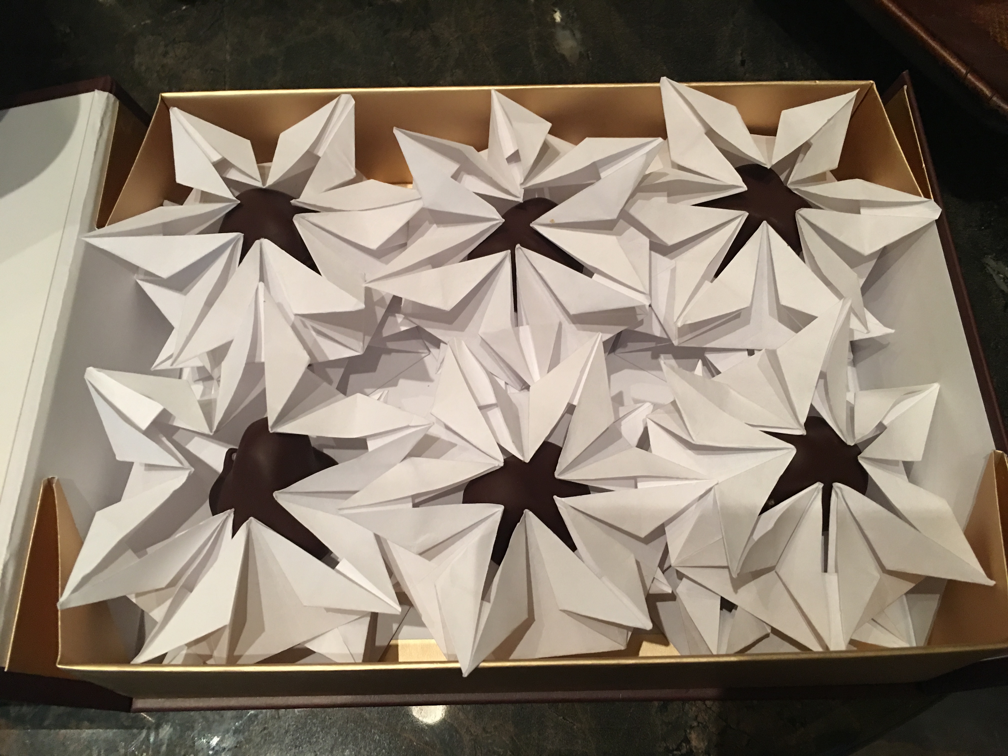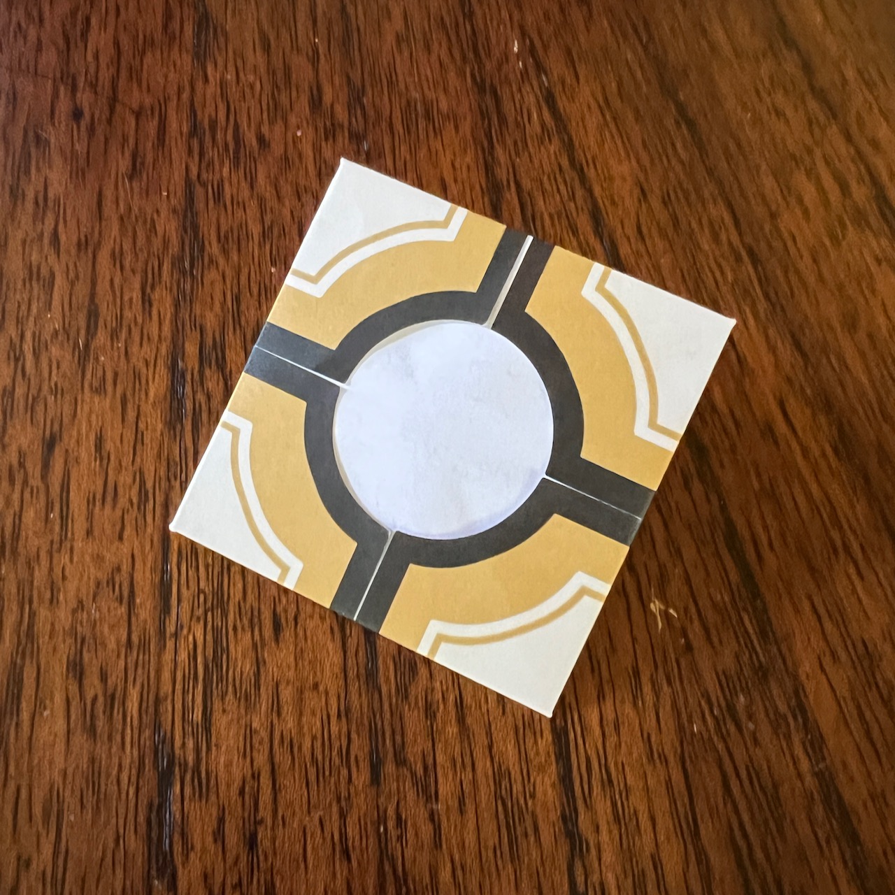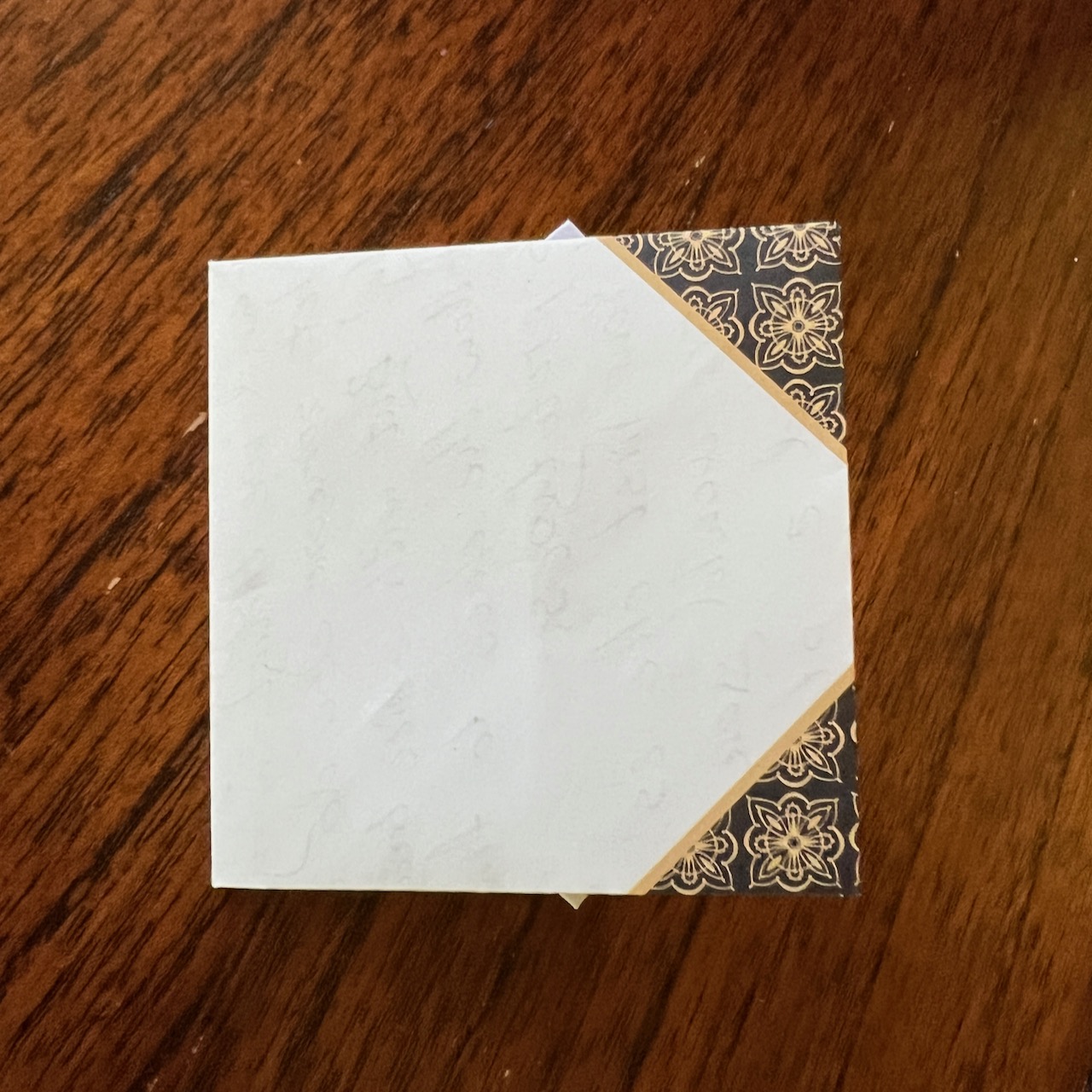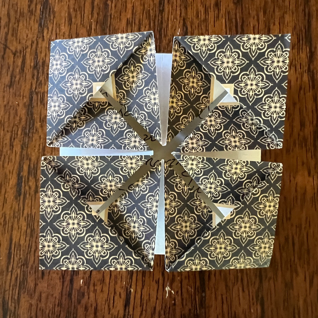 A standard Fortune teller fold, what made it distinctive was the paper, a gift from my mom. It has some very decorative borders that show off well in many of the folds.