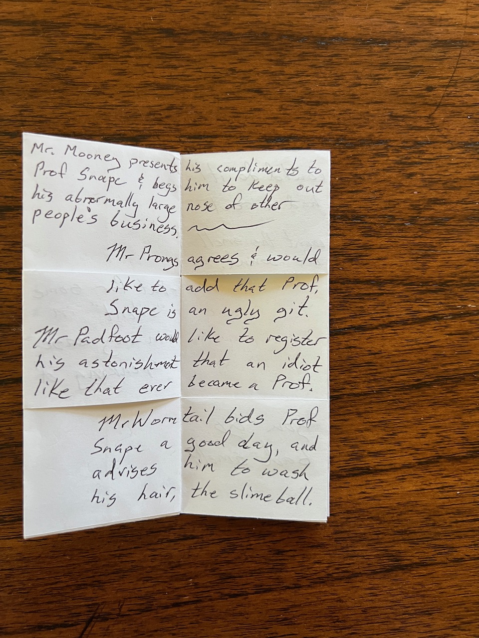 Mr Moony presents his compliments to Professor Snape, and begs him to keep his abnormally large nose out of other people’s business.