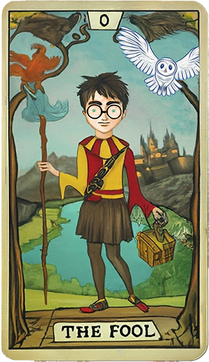 Inside Hedwig was the second page of notes. Wrapped in the note was an actual Tarot card. The one you just read about—but with Harry Potter as the Fool.