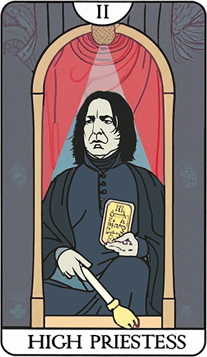As before, wrapped in the notes are two more Harry Potter themed Tarot cards, Dumbledore as the Magician and Snape as the High Priestess. As with the fool, affixed to the top and bottom of the two were slips of paper, with the bottom and top part of some text.