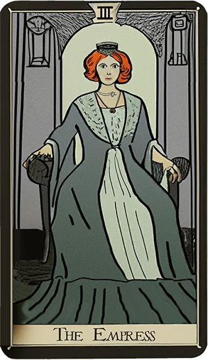 Historically, the Empress, aside from being seen as the ultimate mother-figure, is portrayed as the pragmatic problem solver, but she is also someone who acts with compassion. In Waite-Smith’s tarot, the shield with an eagle, symbolizing royalty, has become a heart, embossed with the symbol for Venus. They also place her outdoors, in front of a field of ripening wheat, with red pomegranates on her vestments. The Empress is maternal and life-giving, but it would be wise to recall her background of social and political power.