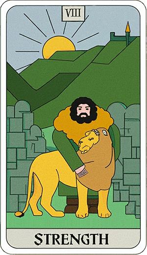 Strength is clearly needed, but it is notable that the art for Waite-Smith is a female figure, her hands lightly on the lion’s head. A garland of flowers adorn her hair and she has a chain of roses as well. The lemniscate, the same as that over the magician’s head, symbolizes life. The lion may represent a force of nature but also may represent an internal struggle with one’s own inner animalistic desires. In either case, the card demonstrates that the path forward is via empathy and understanding, not brute force