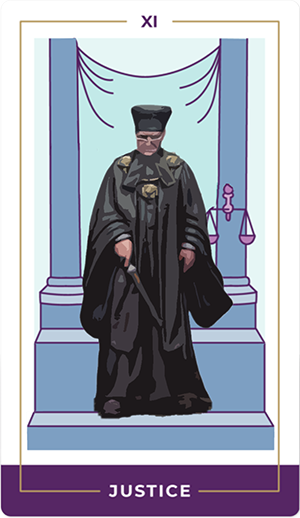 I think the Justice card has many parallels to the Hierophant. Both cards espouse what is clearly a positive value and outcome, but both are also the representation of those values as seen by those currently in charge. It is, in short, the justice of law. While it is a commendable pursuit, its practitioners should aspire to do more than, as Cornelius Fudge said once “Got to be seen to be doing something.”