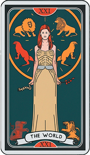 The final card of the trumps or Major Arcana of the Tarot. The same mythological animals from the Wheel of Fortune are present, the dancing woman is surrounded by a wreath of victory. The four living creatures from Ezekiel’s vision in each corner, representing the four elements in harmony. She holds two wands, symbolizing her mastery of all the elements. Note the similarity of the crossed legs of our dancer with the hanged man, but now inverted. This is the hero, reintegrated back into their world, at peace with the world and with themself.
