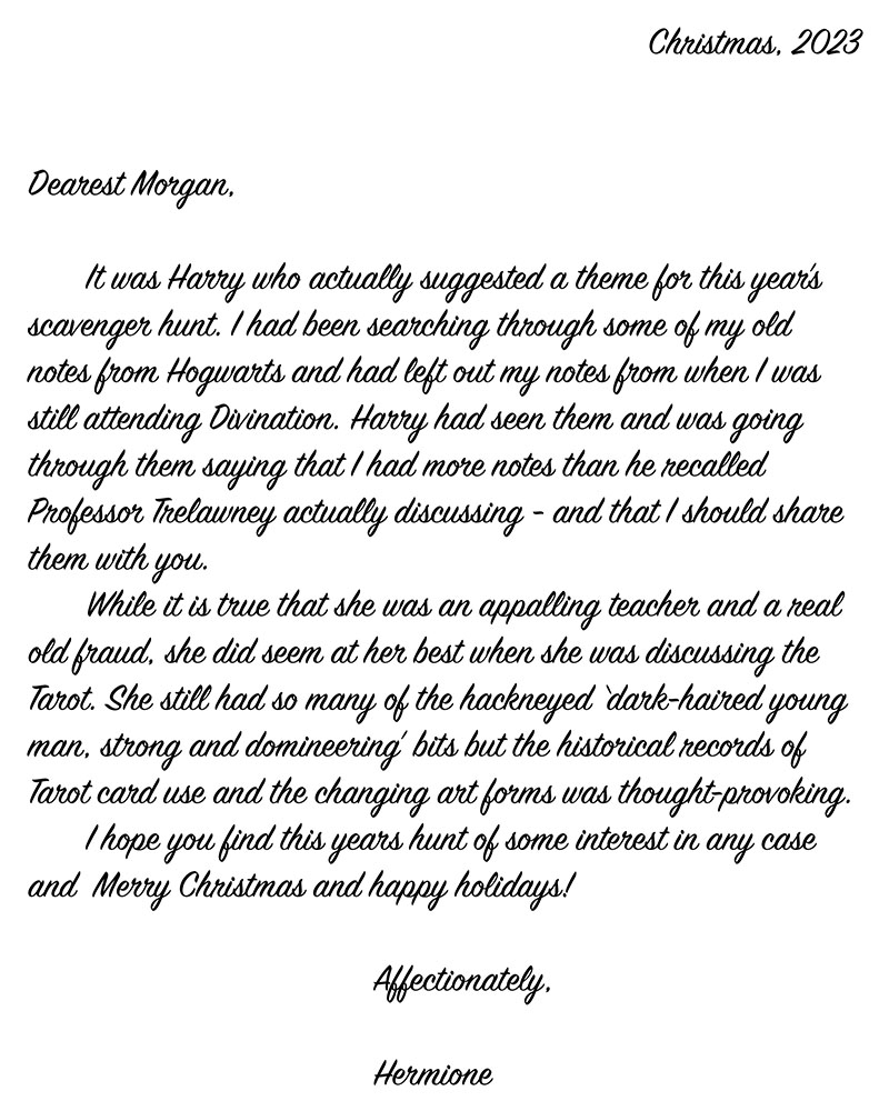It was Harry who actually suggested a theme for this year’s scavenger hunt. I had been searching through some of my old notes from Hogwarts and had left out my notes from when I was still attending Divination. Harry had seen them and was going through them saying that I had more notes than he recalled Professor Trelawney actually discussing - and that I should share them with you.