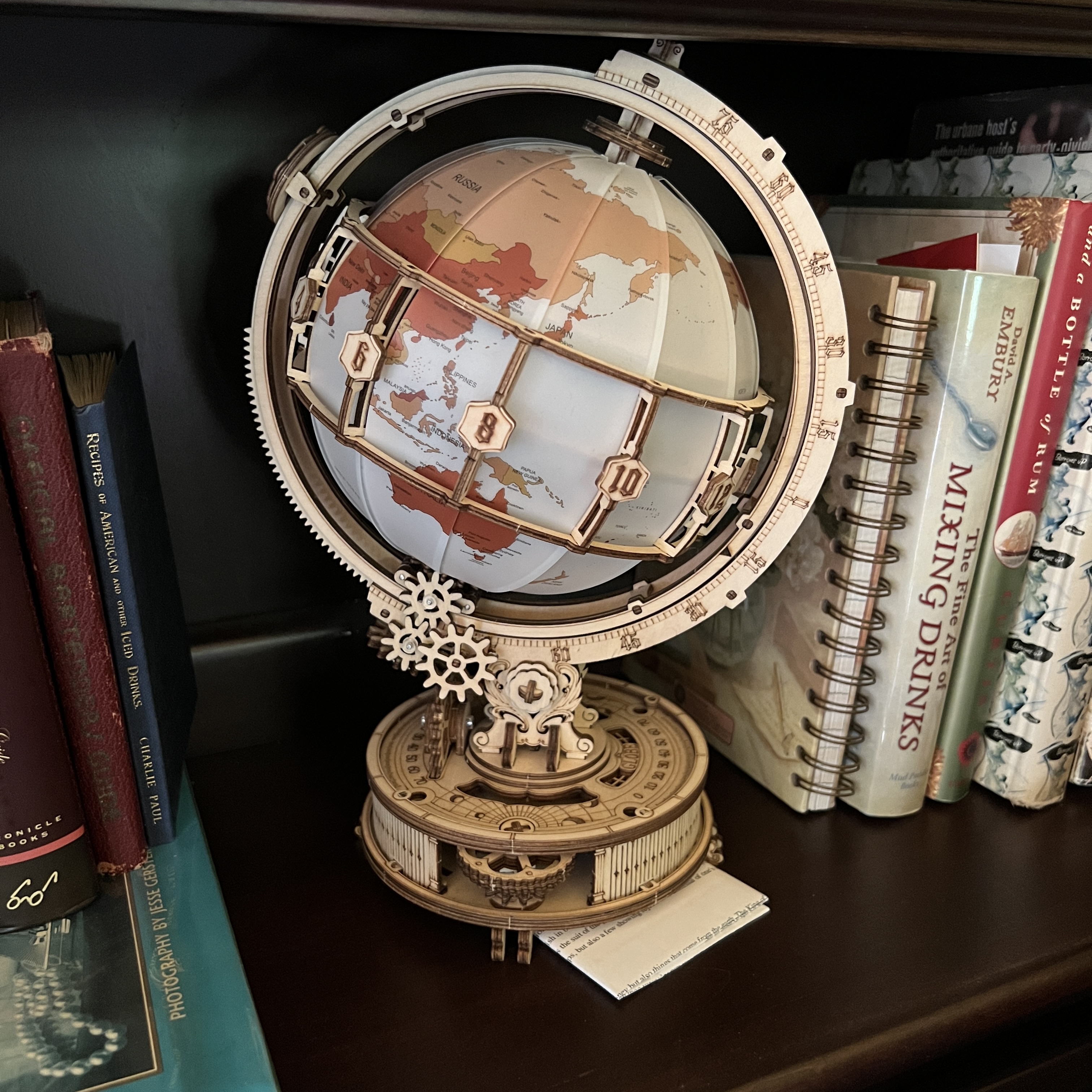 This was a long hunt, not least as she took the time to read through all of the notes, but she said it was one of her favorites. I had thought she might get tripped up on this last clue but she went right to a wooden globe I had made the prior Christmas.