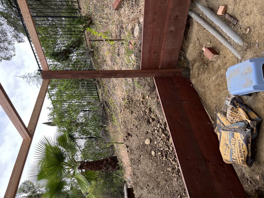 After digging holes for the posts, installing and pouring concrete around them, we started getting the initial frame and exterior pressure boards for the retaining walls, starting from the corner of the existing coop. Where Morgan is standing will be the full-sized doorway to access the run. We will later cut out a chicken-sized doorway where the shovel is to allow the chickens to come and go or to shut them out of the run (or the coop) for any maintenance or behavioral issues.