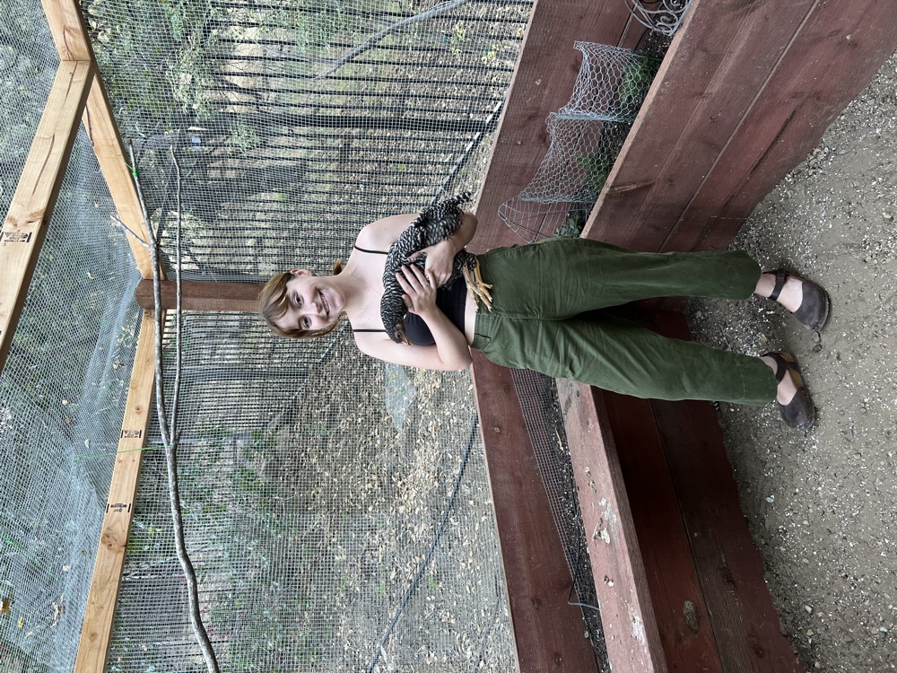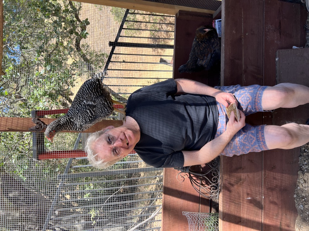 Finally, inside the finished chicken run, with the ill-fated plantings. The Barred Plymouth Rock chicken Morgan is holding was named Peppercorn.