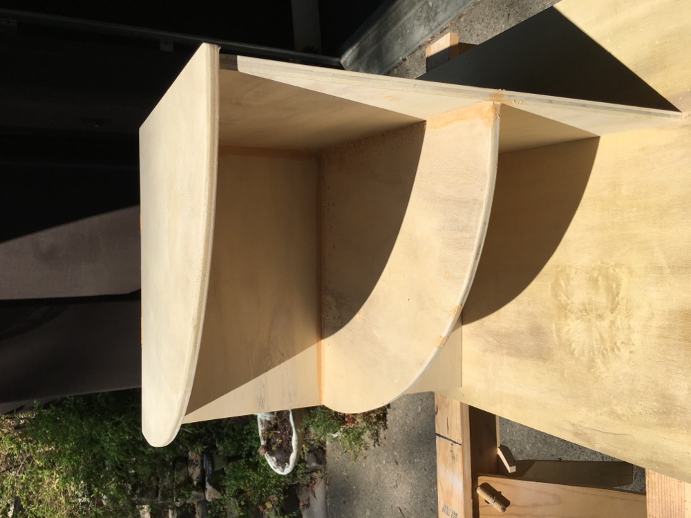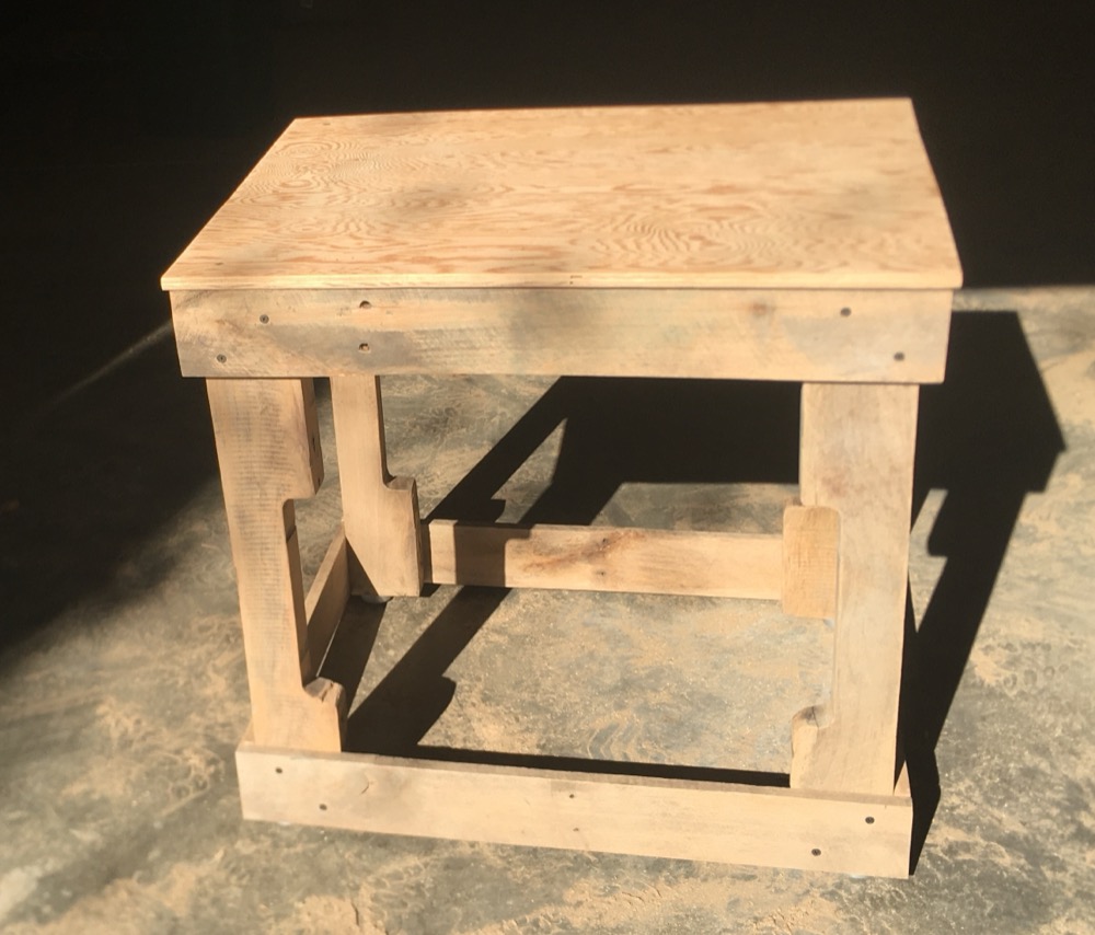 My wife was doing a painting on a very large painting on a large slab of oak from the “When a tree falls” exhibition. She asked if I could make a table for the tree so it would be at the right height for her to paint (I also fashioned the leg to give it some stability). This was from some plywood I had lying around and a semi-busted pallet.