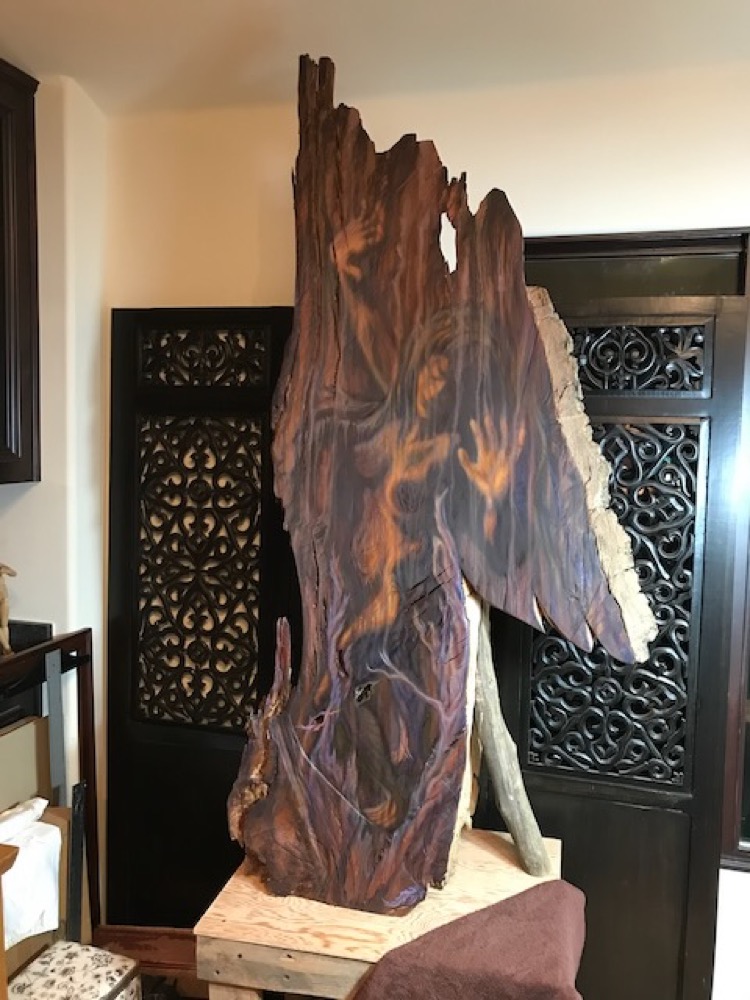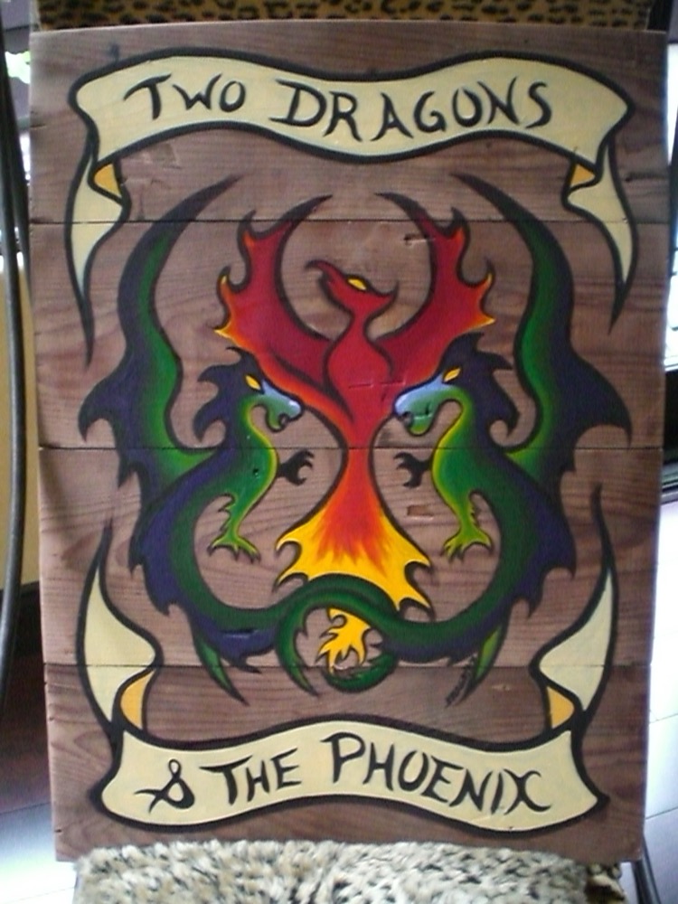 The first thing ever made with the reclaimed redwood was a bar sign painted by my wife. The Two Dragon’s and a Phoenix. The two dragons are my wife and daughter, both Dragons - the Phoenix is the house itself, risen from the ashes.